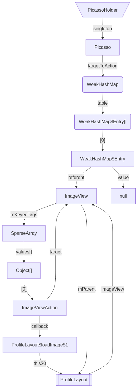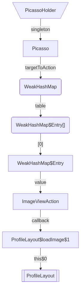 Looking at the Picasso source code we can see that Picasso.targetToAction entries are removed when a request completes, so we can conclude that the image loading request was still in flight and that ProfileLayout was detached and prevented from being garbage collected by that request in flight.