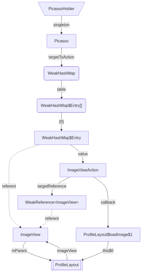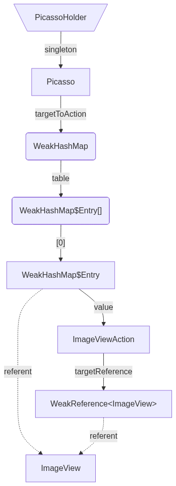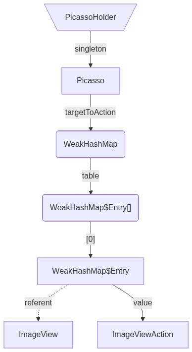 Picasso.targetToAction is a WeakHashMap that holds weak references to the target views & strong references to the corresponding actions.